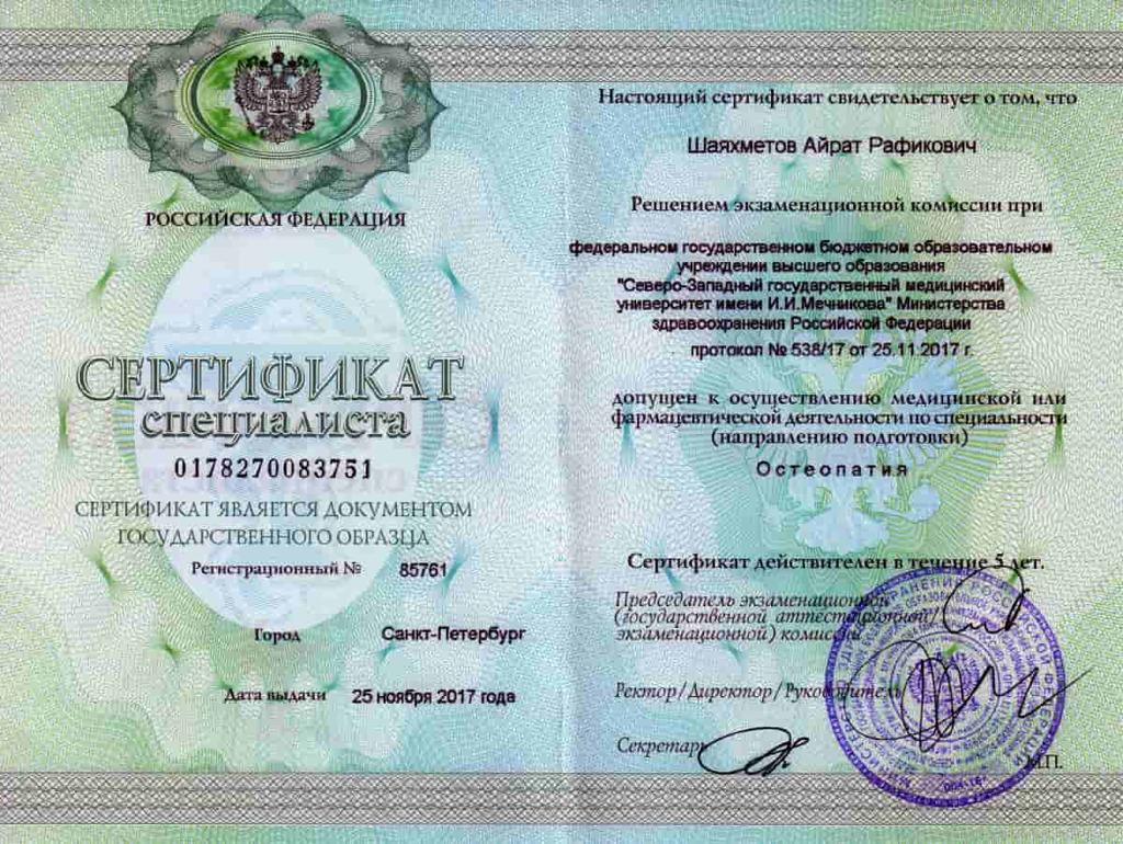 Мы видим, что сертифицированный врач-остеопат Шаяхметов Айрат Рафикович принимает в Уфе (Приволжский федеральный округ). Получил образование по остеопатии в Северо-Западном государственном медицинском университете им. И.И. Мечникова Минздрава России. Имеет диплом о прохождении профессиональной переподготовки и допущении к ведению профессиональной деятельности в сфере «Остеопатия» № 017827 0006034 и сертификат специалиста по остеопатии № 0178270083751, выданный 25.11.2017 и действительный до 25.11.2022. На мой взгляд, информация более чем исчерпывающая.